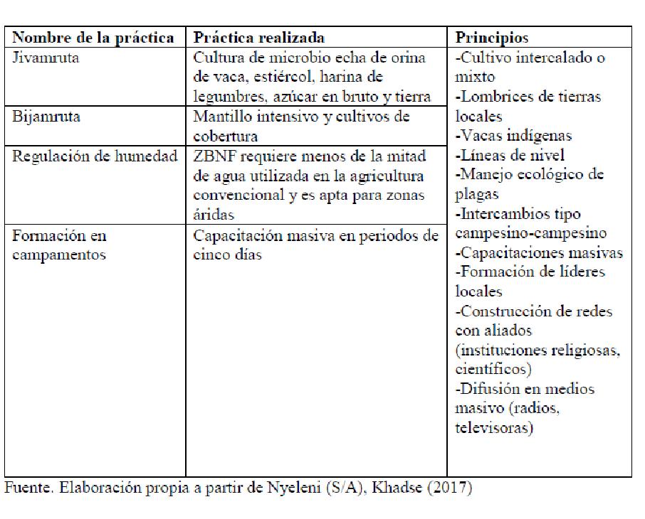 Por su parte, el movimiento Agricultura Natural de Presupuesto Cero por sus siglas en inglés ZNBF es, Según Rosset y Martínez (2013: 12), “parcialmente una respuesta a los severos endeudamientos de muchos campesinos de la India. La idea del ZBNF es utilizar prácticas agroecológicas basadas totalmente en recursos encontrados en las propias fincas, como el mulch, enmiendas orgánicas y diversificación, para romper el ciclo de endeudamiento en las familias campesinas al comprar insumos fuera de la finca”. Khadse et al. (2017) destacan que el movimiento ZBNF ha alcanzado una escala masiva no solo por prácticas agrícolas efectivas, también por una dinámica de movimiento social generada por un proceso de motivación a los miembros de este movimiento social a partir de un movimiento carismático en la India. El ZBNF, es un movimiento campesino de base en India (sobre todo en Karnataka, con aproximadamente 100 mil campesinas y campesinos participando), pero a su vez es una serie de prácticas agroecológicas. El termino presupuesto hace referencia a créditos y gastos, por lo que cero presupuesto significa sin uso de crédito alguno y con la naturaleza, esto último hace referencia a agricultura natural (Nyeléni S/f).